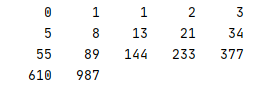 x = [] a = 0 b = 1 c = 0 x.append(a) x.append(b) while True: c = a + b a = b b = c if c < 1000: x.append(c) else: break count = 0 for i in x: print('{:>6}'.format(i), end='') count += 1 if count % 5 == 0: print('')
