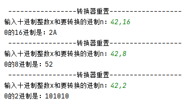 while True: num = [i for i in range(0, 10)] alpha = [chr(i) for i in range(65, 91)] data = num + alpha print('\n', '{:-^40}'.format('转换器重置')) list1 = [] x, n = eval(input('输入十进制整数x和要转换的进制n:')) while x != 0: list1.append(data[x % n]) x = x // n print(f'{x}的{n}进制是:', end='') list1 = list1[::-1] for i in list1: print(i, end='')