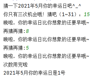 import random x = random.randint(1, 31) count = 0 info = eval(input('猜一下2021年5月你的幸运日吧^_^\n你只有三次机会哦!猜吧(1~31):')) if info == x: print('Bingo!') exit() else: count += 1 while count < 3: if info < x: print('早啦早啦,填早啦!你的幸运日还早呢~') elif info > x: print('晚啦,你的幸运日比你想象的还要早哦~') else: print('Bingo!') exit() info = eval(input('再猜再猜:')) count += 1 else: if info < x: print(f'早啦早啦,填早啦!你的幸运日还早呢~\n次数用完啦\n2021年5月你的幸运日是{x}号') elif info > x: print(f'晚啦,你的幸运日比你想象的还要早哦~\n次数用完啦\n2021年5月你的幸运日是{x}号') else: print('Bingo!') exit()