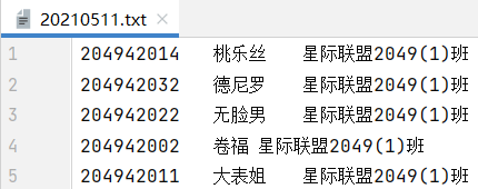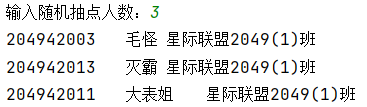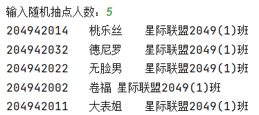 1 #时间模块 2 import datetime 3 t = datetime.datetime.now() 4 t = t.strftime('%Y%m%d') 5 6 import random 7 with open('data7.txt', 'r', encoding='gbk')as f: 8 data = f.read().split('\n') 9 10 info = eval(input('输入随机抽点人数:')) 11 # 随机抽取模块 12 output = set() 13 while len(output) < info: 14 rand = random.randint(0, len(data) - 1) 15 output.add(str(data[rand])) 16 # 写入模块 17 with open(f'{t}.txt', 'w+', encoding='utf-8')as f: 18 for line in output: 19 f.write(line + '\n') 20 print(line)