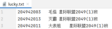 1 import random 2 3 with open('data7.txt', 'r', encoding='gbk')as f: 4 data = f.read().split('\n') 5 6 info = eval(input('输入随机抽点人数:')) 7 # 随机抽取模块 8 output = set() 9 while len(output) < info: 10 rand = random.randint(0, len(data) - 1) 11 output.add(str(data[rand])) 12 # 写入模块 13 with open('lucky.txt', 'w+', encoding='utf-8')as f: 14 for line in output: 15 f.write(line + '\n') 16 print(line)