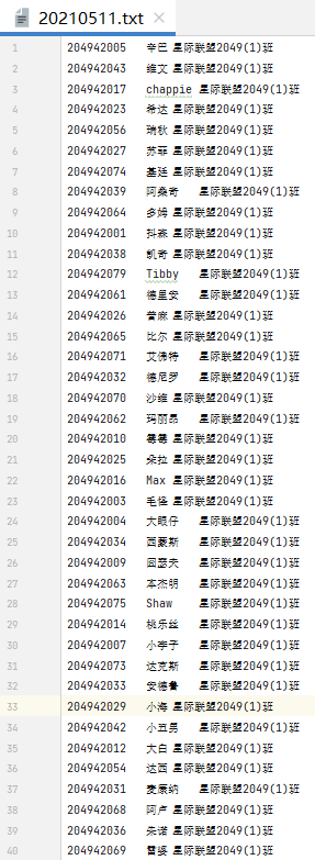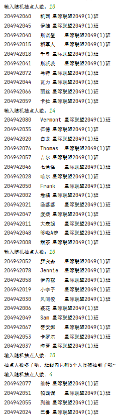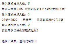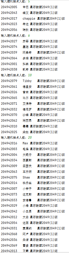 1 import random 2 # 时间模块 3 import datetime 4 t = datetime.datetime.now() 5 t = t.strftime('%Y%m%d') 6 with open('data7.txt', 'r', encoding='gbk')as f: 7 data = f.read().split('\n') 8 info = eval(input('输入随机抽点人数:')) 9 # 使用集合:防止总名单重复 10 output = set() 11 while info > 0: 12 in_data = set() # 使用集合防止单次抽点出现重复 13 # 随机抽取模块 14 while len(in_data - output) < info and len(data) >= len(output) + info: 15 rand = random.randint(0, len(data) - 1) 16 in_data.add(str(data[rand])) 17 if len(data) < len(output) + info and len(data) - len(output) != 0: 18 print(f'抽点人数多了哟,班级内只剩{len(data) - len(output)}个人没被抽到了哦~') 19 elif len(data) - len(output) == 0: 20 print('班级同学已经全部被点过啦!') 21 exit() 22 else: 23 # 写入模块 24 with open(f'{t}.txt', 'a+', encoding='utf-8')as f: 25 for line in in_data - output: 26 f.write(line + '\n') 27 print(line) 28 output = output | in_data 29 info = eval(input('输入随机抽点人数:'))