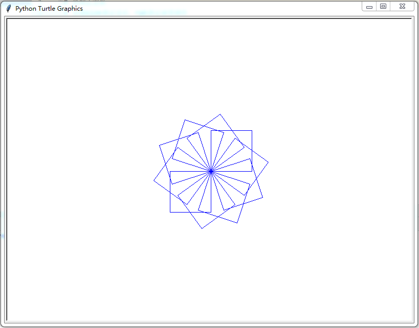 1 from turtle import * 2 3 # 绘制正方形 4 # 参数size指定边长,rgb指定画笔颜色 5 # 如果没有给参数,采用默认值 6 def square(size=50, rgb = 'blue'): 7 pencolor(rgb) 8 for i in range(4): 9 fd(size) 10 left(90) 11 12 def main(): 13 setup(800, 600) 14 speed(0) 15 16 for i in range(10): 17 square(80) 18 left(36) 19 20 hideturtle() 21 done() 22 23 24 if __name__ == '__main__': 25 main()