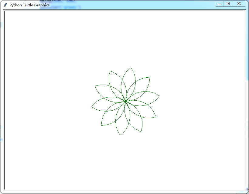 1 from turtle import * 2 3 setup(800, 600) 4 pencolor('green') 5 6 for i in range(10): 7 # 绘制一片花瓣 8 for i in range(2): 9 circle(80, 90) 10 left(90) 11 12 right(36) 13 14 hideturtle() 15 done()