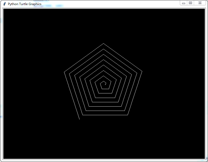 1 from turtle import * 2 3 speed(0) 4 setup(800, 600) 5 bgcolor('black') 6 pencolor('white') 7 8 angle = 0 9 size = 2 10 11 for i in range(8): 12 for j in range(5): 13 fd(size) 14 angle += 72 15 seth(angle) 16 size += 5 17 18 hideturtle() 19 done()