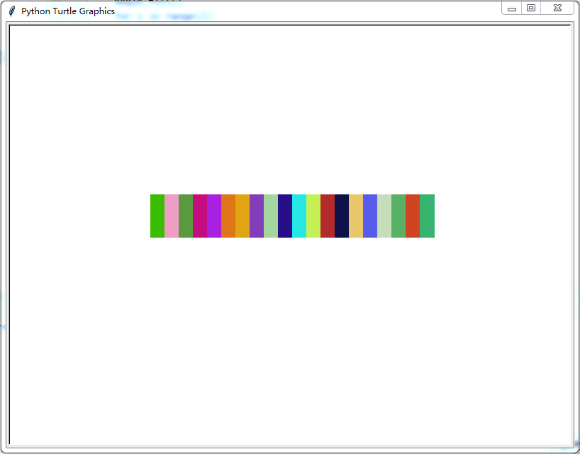 1 from turtle import * 2 from random import * 3 4 def moveto(x, y): 5 penup() 6 goto(x, y) 7 pendown() 8 9 def square(x, y, z = [0, 0, 0]): 10 seth(-90) 11 color(z) 12 begin_fill() 13 for i in range(2): 14 for ii in range(1): 15 left(90) 16 fd(x) 17 left(90) 18 fd(y) 19 end_fill() 20 21 22 setup(800, 600) 23 list1 = [[random() for ii in range(3)] for i in range(20)] 24 25 x = -200 26 for i in range(20): 27 moveto(x, 0) 28 square(20, 60, list1[i]) 29 x += 20 30 31 hideturtle() 32 done()