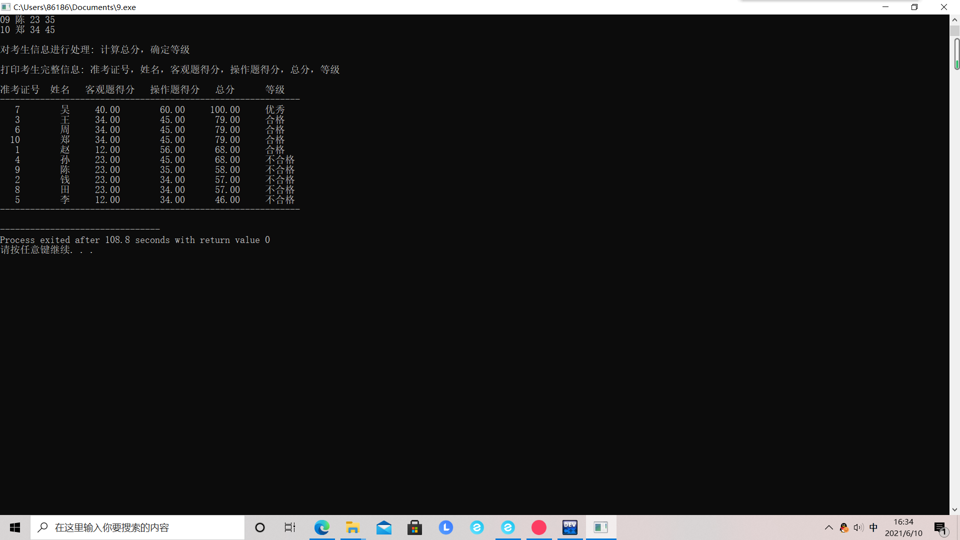 printf("\n打印考生完整信息: 准考证号,姓名,客观题得分,操作题得分,总分,等级\n\n");
