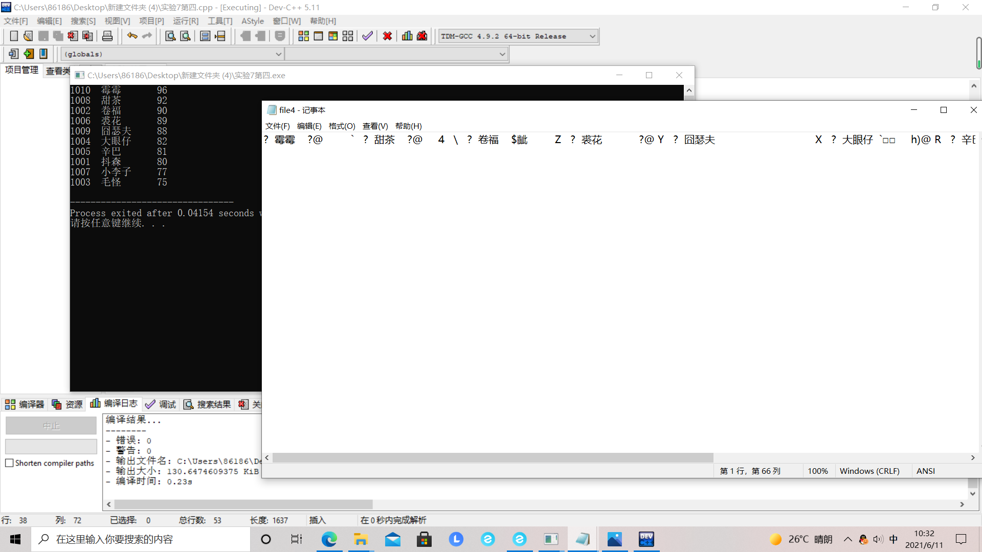 // 从文本数据文件file1.dat中读入数据,按成绩从高到低排序,并将排序结果输出到屏幕上,同时,也以二进制方式存入文件file4.dat中。