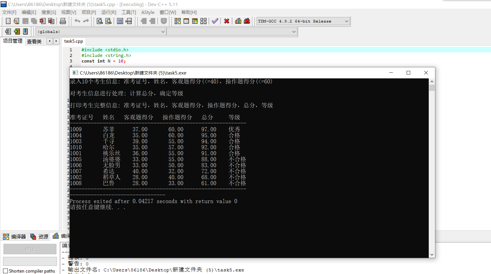 printf("\n打印考生完整信息: 准考证号,姓名,客观题得分,操作题得分,总分,等级\n");