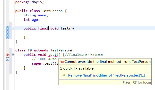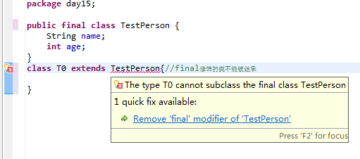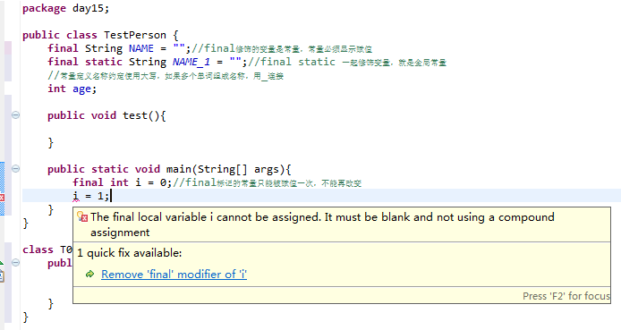 package day15; public class TestPerson { final String NAME = "";//final修饰的变量是常量,常量必须显示赋值 final static String NAME_1 = "";//final static 一起修饰变量,就是全局常量 //常量定义名称约定使用大写,如果多个单词组成名称,用_连接 int age; }