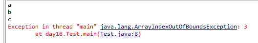 package day16; public class Test { public static void main(String[] args){ String[] strs = new String[]{"a","b","c"}; for(int i = 0; i < 4; i++){//strs只有0,1,2三个元素,没有第四个元素,这个时候输出strs[3]超出了数组长度,会报异常 //java.lang.ArrayIndexOutOfBoundsException 数组越界 System.out.println(strs[i]); } } }