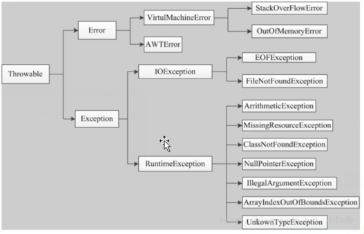 ②Exception:其他因编程错误或偶然的外在因素导致的一般性问题。(例如:空指针访问,试图读取不存在的文件,网络连接中断)