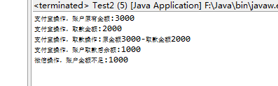 package day20; public class Test2 { public static void main(String[] args){ //定义账户对象 Acount a = new Acount(); Acount a1 = new Acount(); //多线程对象 User u_weixin = new User(a,2000); User u_zhifubao = new User(a,2000); Thread weixin = new Thread(u_weixin,"微信"); Thread zhifubao = new Thread(u_zhifubao,"支付宝"); weixin.start(); zhifubao.start(); } } class Acount{ public static int money = 3000; public synchronized void drawing5(int m,Acount a){ synchronized(a){//表示通过方法的参数传递进来的对象的代码块,被加了synchronized同步锁 //不同的对象就有了不同的同步锁 String name = Thread.currentThread().getName(); //需求:如果是微信操作的,先不执行,等支付宝操作,支付宝操作完,微信再继续操作 if(name.equals("微信")){ try { a.wait();//当前线程进入等待的阻塞状态 } catch (InterruptedException e) { // TODO Auto-generated catch block e.printStackTrace(); } } if(money < m){ System.out.println(name + "操作,账户金额不足:" + money); }else{ System.out.println(name + "操作,账户原有金额:" + money); System.out.println(name +"操作,取款金额:" + m); System.out.println(name +"操作,取款操作:原金额" + money + "-" +"取款金额" + m); money = money - m; System.out.println(name +"操作,账户取款后余额:" + money); } if(name.equals("支付宝")){ a.notify();//唤醒当前优先级最高的线程,进入就绪状态 // a.notifyAll();//唤醒当前所有的线程,进入就绪状态 } } } } class User implements Runnable{ Acount acount; int money; public User(Acount acount,int money){ this.acount = acount; this.money = money; } public void run() { acount.drawing5(money,acount); } }