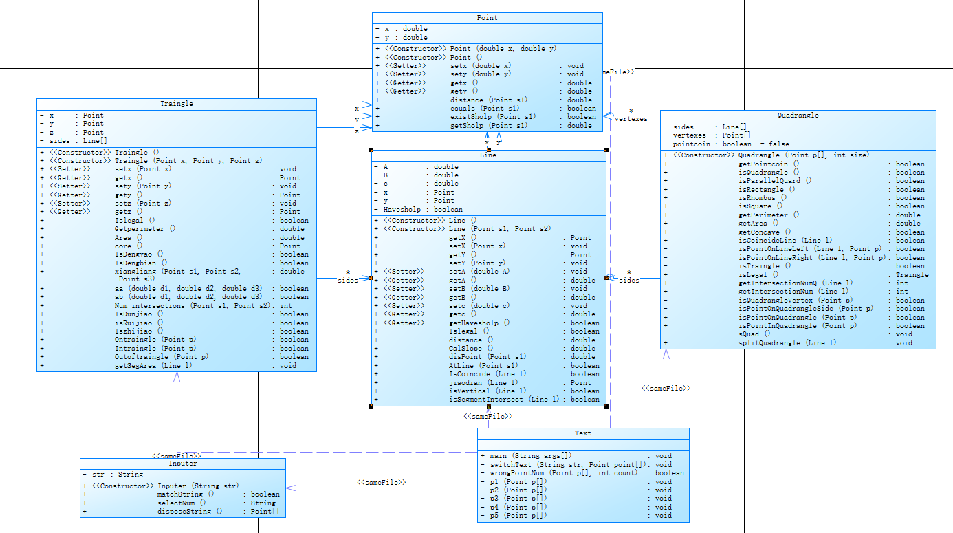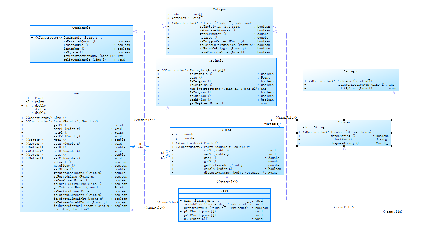 这里先放四边形和五边形大作业的类代码块,代码都有注释,有需要的可以看看。下面单独的分析就不放代码了,只做分析。(类包括四边形、五边形、多边形以及点线的类代码。)
