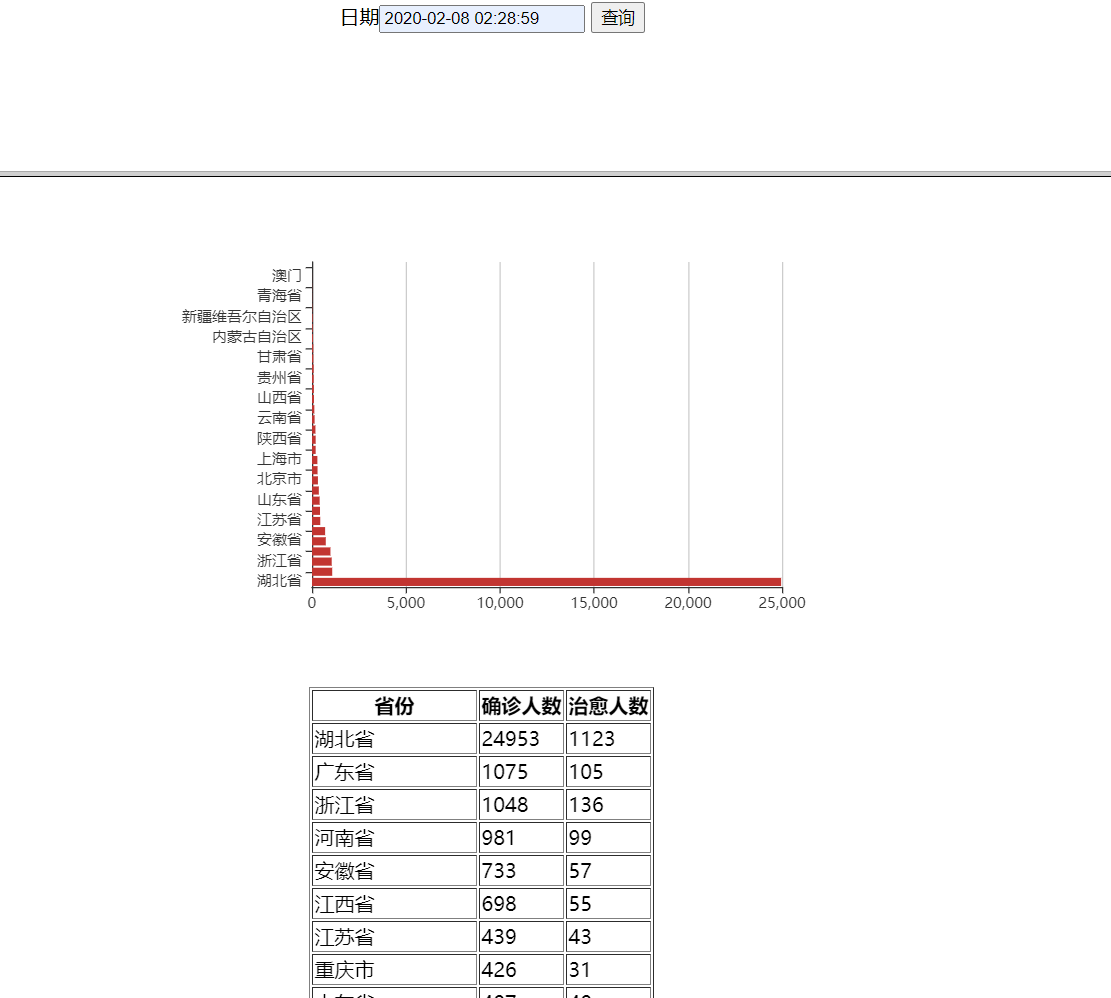 <%@page import="bean.Province"%> <%@page import="java.util.List"%> <%@ page language="java" contentType="text/html; charset=UTF-8" pageEncoding="UTF-8"%> <!DOCTYPE html> <html> <head> <meta charset="utf-8"> <title>ECharts</title> <!-- 引入 echarts.js --> <script src="Echart/echarts.min.js"></script> </head> <body> <% request.setCharacterEncoding("utf-8"); List <Province> provinces =(List<Province>) request.getAttribute("provinces"); int i=0;%> <div align="center"> <div id="main" align="center" style="width: 600px;height:400px;" > <script type="text/javascript"> var myChart = echarts.init(document.getElementById('main')); var option = { dataset: { source: [ [ '省份','确诊人数'], <% //获取request域中的数据 if(provinces!=null){ for(Province province:provinces){i++; %> [<%=province.getConfirmed_number()%>,'<%=province.getName()%>'], <% if(i>33)break; } } %> ] }, grid: {containLabel: true}, xAxis: {}, yAxis: {type: 'category'}, series: [ { type: 'bar', encode: { // 将 "amount" 列映射到 X 轴。 x: '省份', // 将 "product" 列映射到 Y 轴。 y: '确诊人数' } }] }; // 使用刚指定的配置项和数据显示图表。 myChart.setOption(option); </script> </div> </div> <table border="1px" align="center"> <tr> <th>省份</th> <th>确诊人数</th> <th>治愈人数</th> </tr> <% if(provinces!=null){ for(Province province:provinces){ %> <tr> <td><%=province.getName() %></td> <td><%=province.getConfirmed_number() %></td> <td><%=province.getCured_number() %></td> </tr> <% } } %> </table> </body> </html>