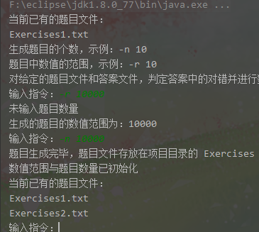 package cn.oy.szys; import java.io.IOException; import java.util.Scanner; /** * 对外开放主类 */ public class OpenMain { //数值范围,默认为 0 int range = 0; //题目数量,默认为 0 int questions = 0; public void test() { FileName question = new FileName(); System.out.println("当前已有的题目文件:"); //获取所有的题目文件数 question.getExercisesName(); //question.get_AnswersName(); System.out.println("生成题目的个数,示例:-n 10 "); System.out.println("题目中数值的范围,示例:-r 10"); System.out.println("对给定的题目文件和答案文件,判定答案中的对错并进行数量统计,示例:-e <exercisefile>.txt -a <answerfile>.txt"); while (true) { //输入操作指令 inputOpStrs(); if(range < 0 || questions < 0){ System.out.println("参数值必须为正数"); continue; } if (range == 0 || questions == 0) { if (questions == 0) System.out.println("未输入题目数量"); else{ System.out.println("将生成题目数量为:" + questions); } if (range == 0) System.out.println("未输入数值范围"); else{ System.out.println("生成的题目的数值范围为:" + range); } } else { new Create(range, questions);//题目生成 System.out.println("题目生成完毕,题目文件存放在项目目录的 Exercises 文件夹中,答案文件存放在 Answers 文件夹中"); this.range = 0; //初始化数组范围和题目数量范围 this.questions = 0; System.out.println("数值范围与题目数量已初始化"); System.out.println("当前已有的题目文件:"); question.getExercisesName(); } } } private void inputOpStrs(){ // 创建Scanner对象 Scanner scanner = new Scanner(System.in); System.out.print("输入指令:"); // 获取操作指令 String opStr = scanner.nextLine(); //操作指令分割,通过空格分割,变成操作指令字符串 String[] opStrs = opStr.split("\\s+"); //根据不同的情况进行处理 switch (opStrs[0]) { case "-n": this.questions = Integer.parseInt(opStrs[1]); break; case "-r": this.range = Integer.parseInt(opStrs[1]); break; case "-e": //-e Exercises1.txt -a Answers1.txt try { //opStrs[1]是题目文件名,opStrs[3]是答案文件名,FileOperate:文件操作类 //根据传入的题目文件名 和 答案文件名 进行 匹配校验 new FileOperate().proFile(opStrs[1], opStrs[3], questions); System.out.println("对错判断完毕,请在 Finally 文件夹中查看"); } catch (IOException e) { e.printStackTrace(); } break; default: break; } } }