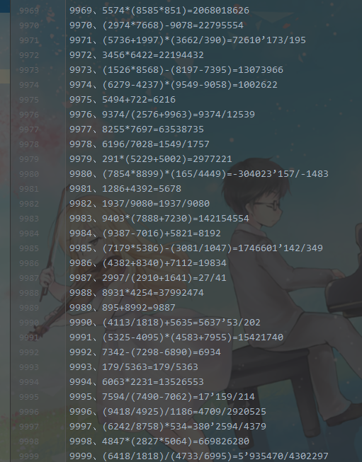 class Exercise { int value; //数的和,单个数的时候是本身,两个数的时候是两数的运算结果 int value1; //两个数的时候第一个数 int value2; //两个数的时候第二个数 int sign = 0;//符号标志,默认为 0,整数 String createExercise; //createExercise 用来存放算式 String fraction; //fraction 用来存放分数结果 char symbol; boolean swap = false; //是否出现负数需要调换 boolean isFraction = false; //是否是分式 char[] symbols = new char[]{'+', '-', '*', '/'}; public Exercise(int range) { if ((Math.random() * 2) <= 1) { //只有一数的情况 value = (int) (Math.random() * (range - 1) + 1); createExercise = String.valueOf(value); symbol = '\0'; } else { //两个数的情况 value1 = (int) (Math.random() * range + 1); value2 = (int) (Math.random() * range + 1); //随机选取一个符号 + - * / symbol = symbols[(int) (Math.random() * 4)]; //如果是 / ,那么特殊处理 if (symbol == '/' && value1 % value2 != 0) { isFraction = true; fraction = proFraction(value1, value2); } else { value = getValue(value1, value2, symbol); } if (swap) { value = -value; createExercise = "(" + value2 + symbol + value1 + ")"; } else { createExercise = "(" + value1 + symbol + value2 + ")"; } } } public int getValue(int a, int b, char symbol) { switch (symbol) { case '+': return a + b; case '-': if (a < b) swap = true; return a - b; case '/': return a / b; case '*': return a * b; } return 0; } /** * 计算结果,得到表达式的答案 * * @param a * @param b * @param c * @param d * @param symbol * @return */ public String getAnswer(int a, int b, int c, int d, char symbol) { int molecule; int denominator; switch (symbol) { case '+': molecule = a * d + b * c; denominator = b * d; return proFraction(molecule, denominator); case '-': molecule = a * d - b * c; denominator = b * d; if (molecule < 0) { this.sign = 1; return proFraction(-molecule, denominator); } return proFraction(molecule, denominator); case '/': molecule = a * d; denominator = b * c; return proFraction(molecule, denominator); case '*': molecule = a * c; denominator = b * d; return proFraction(molecule, denominator); } return null; } /** * 处理分数 * * @param molecule 分子 * @param denominator 分母 * @return */ public String proFraction(int molecule, int denominator) { //商 int merchant = molecule / denominator; //将分数化为真分数,那么需要将分子减去多余的分母的倍数 molecule -= merchant * denominator; //得到分子和分母的最大公约数 int gcdNum = gcd(molecule, denominator); //存储化简分数结果 String res = ""; //分子为 0,那么结果直接就是 商 if (molecule == 0) { res = String.valueOf(0); } else { //分子不为 0,那么根据商的结果判断是真分数还是假分数,对应做处理 res = String.valueOf(molecule / gcdNum) + '/' + denominator / gcdNum; //如果商不为 0,那么我们将商的结果也加到结果字符串中 if (merchant != 0) { res = String.valueOf(merchant) + '’' + res; } } return res; } private int gcd(int a, int b) { if (a % b == 0) { return b; } return gcd(b, a % b); } }