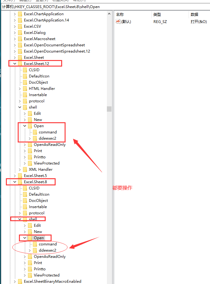 2.同理,将【HKEY_CLASSES_ROOT\Excel.Sheet.8\shell\Open】的三个如上操作