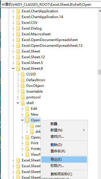 【HKEY_CLASSES_ROOT\Excel.Sheet.8\shell\Open】-右键-导出-桌面备份