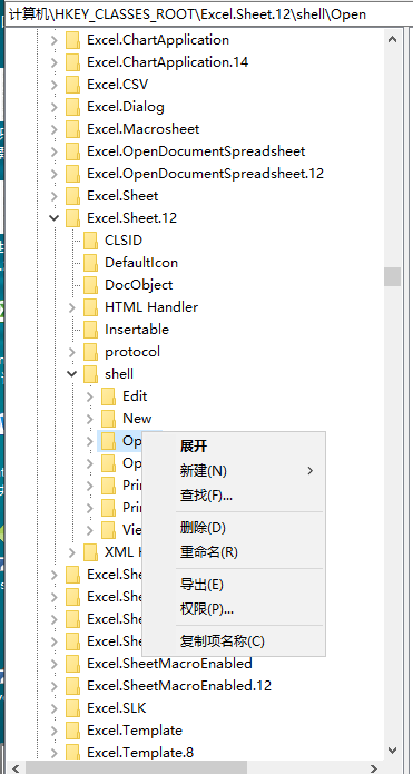 【HKEY_CLASSES_ROOT\Excel.Sheet.12\shell\Open】-右键-导出-桌面备份