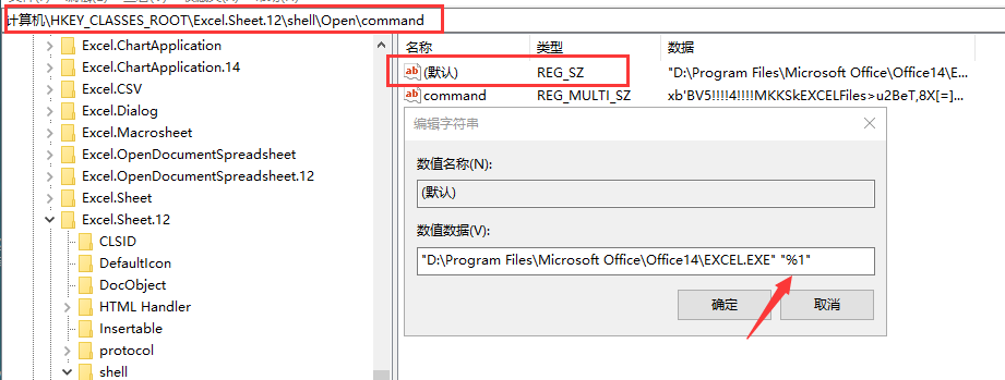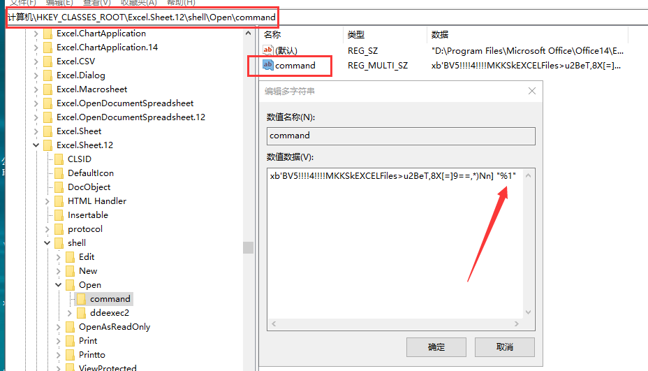 1.修改【HKEY_CLASSES_ROOT\Excel.Sheet.12\shell\Open\command】下的