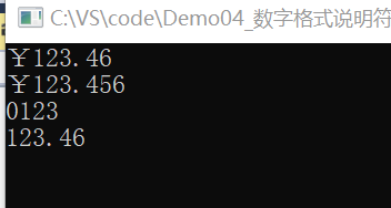 namespace Demo04 { class Program { static void Main(string[] args) { double d = 123.456; //数字格式说明符 Console.WriteLine("{0:c}",d); //货币符号 Console.WriteLine("{0:c3}", d); Console.WriteLine("{0:d4}", 123); //十进制数(把123改成0123,保证数字长度一致) Console.WriteLine("{0:f2}", d); // 浮点数 Console.ReadKey(); } } }