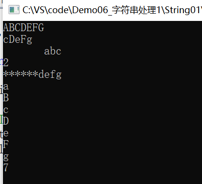 namespace String01 { class Program { static void Main(string[] args) { char[] ch1 = { 'a', 'B', 'F' }; string str = "aBcDeFg"; Console.WriteLine(str.ToUpper());// Console.WriteLine(str.ToLower()); Console.WriteLine(str.Trim(ch1));//移除字符串两端的指定字符 string str1 = "abc"; Console.WriteLine(str1.PadLeft(10));//左侧填充空格实现右对齐 Console.WriteLine(str1.IndexOf('c')); string str2 = "defg"; Console.WriteLine(str2.PadLeft(10, '*')); string.Equals(str1, str2); //bool b = str1.Equals(str2); foreach (char ch in str) //循环输出字符串str中的字符 { Console.WriteLine(ch); } //char[] ch = str.ToCharArray(); //将字符串复制到字符数组中 int len = str.Length; Console.WriteLine(len); Console.ReadKey(); } } }