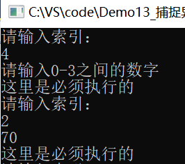 static void Main(string[] args) { int[] age = { 12, 45, 70, 34 }; while (true) { Console.WriteLine("请输入索引:"); int index = int.Parse(Console.ReadLine()); try //抛出异常(可能出现异常的语句)可以有一个try块,多个catch块 { Console.WriteLine(age[index]); } catch (Exception ex) //处理异常,Exception是所有异常的基类 { Console.WriteLine("请输入0-3之间的数字"); } finally //始终会处理的代码 { Console.WriteLine("这里是必须执行的"); } } }