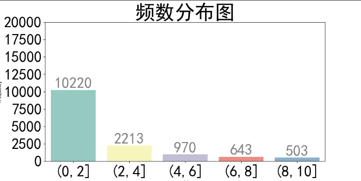 import matplotlib.pyplot as plt import matplotlib as mpl import pandas as pd import numpy as np import seaborn as sns # 制作频数分布表 # 分割区间 data_split = pd.cut(rawdata, [0, 2, 4, 6, 8, 10], labels=[u"(0,2]", u"(2,4]", u"(4,6]", u"(6,8]", u"(8,10]"]) #计算每个区间的频数并按上面的labels调整顺序 freq_chart = data_split.value_counts() freq_chart = freq_chart.sort_index() #保存为一个频率分布字典 freq_dict= {'section': freq_chart.index, 'frequency': freq_chart.values} #将对应的频率分布字典转化为pd文件 freq_data = pd.DataFrame(freq_dict) ax = plt.figure(figsize=(10, 5)).add_subplot(111) sns.barplot(x="section", y="frequency", data=freq_data, palette="Set3") # palette设置颜色 #设置y轴高度 y轴高度最好为最大都轴超20% ax.set_ylim([0, 20000]) ax.set_title('频数分布图', size=40) #设置字体大小 plt.xticks(fontsize=30) plt.yticks(fontsize=30) #设置数据标签 for x, y in zip(range(5), freq_data.frequency): ax.text(x, y, '%d' % y, ha='center', va='bottom', fontsize=30, color='grey') plt.show()