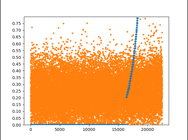 import matplotlib.pyplot as plt import pandas as pd import numpy as np rawdata = pd.read_excel("./data/test_result.xlsx") print(rawdata) test=rawdata['test'] result=rawdata['result'] y=rawdata['index'] #y轴高度 plt.ylim((0, 0.8)) #y轴精度 plt.yticks(np.arange(0,0.8,0.05)) #Z轴空间凸显 plt.scatter(y,test,marker='.',zorder=3) plt.scatter(y,result,marker='.') plt.show()