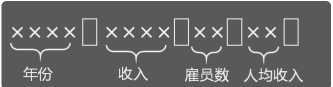 ① 补全程序,实现题目要求,把年份、收入、雇员人数、人均收入,以结构化方式写入table段中。 表格中,每行数据,在逻辑段table中占16个字节,各项数据占据字节大小分配如下。期中,数据之间用 空格间隔。
