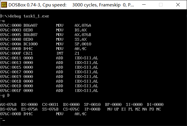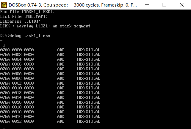 任务1-1 对程序task1_1.asm进行汇编、连接,用debug加载、跟踪调试,基于结果,回答问题。