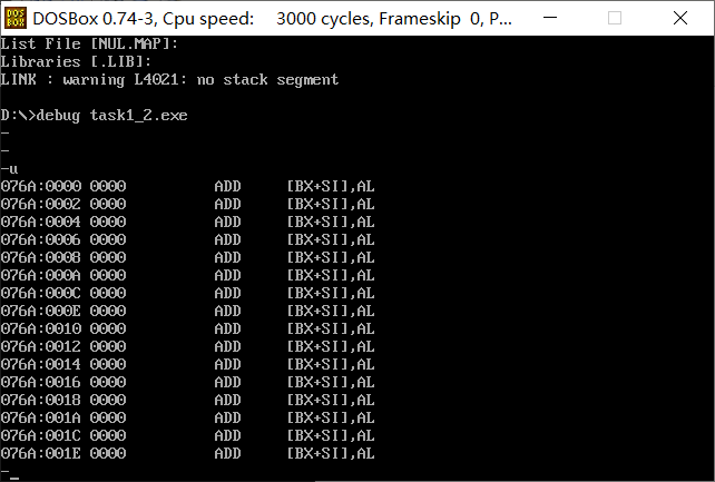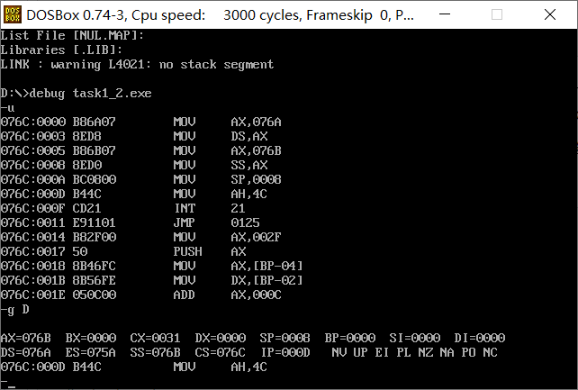 任务1-2 对程序task1_2.asm进行汇编、连接,用debug加载、跟踪调试,基于结果,回答问题。