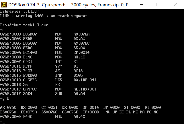 任务1-3 对程序task1_3.asm进行汇编、连接,用debug加载、跟踪调试,基于结果,回答问题。