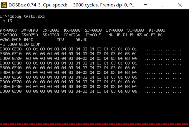 1 assume cs:code 2 code segment 3 start: 4 mov ax, 0b800h 5 mov ds, ax 6 7 mov bx, 0f00h 8 mov cx, 50h 9 mov ax, 0403h 10 s: mov ds:[bx], ax 11 add bx, 2 12 loop s 13 14 mov ah, 4ch 15 int 21h 16 code ends 17 end start