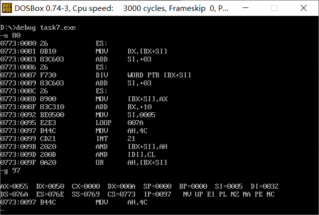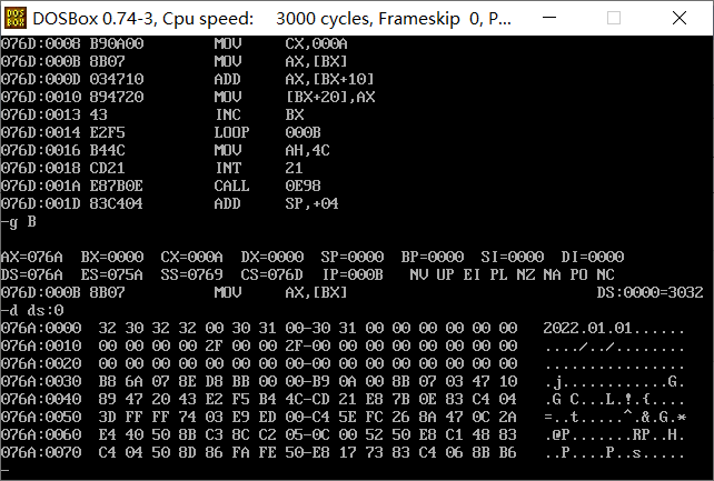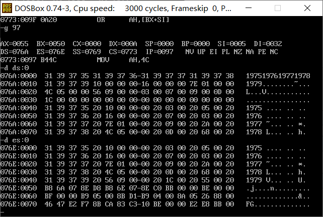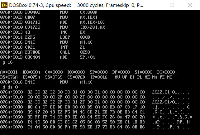 1 assume ds:data1, cs:code 2 data1 segment 3 db 50, 48, 50, 50, 0, 48, 49, 0, 48, 49 ; ten numbers 4 data1 ends 5 6 data2 segment 7 db 0, 0, 0, 0, 47, 0, 0, 47, 0, 0 ; ten numbers 8 data2 ends 9 10 data3 segment 11 db 16 dup(0) 12 data3 ends 13 14 code segment 15 start: 16 mov ax, data1 17 mov ds, ax 18 19 mov bx, 0 20 mov cx, 0ah 21 s: mov ax, ds:[bx] 22 add ax, ds:[bx+10h] 23 mov ds:[bx+20h], ax 24 inc bx 25 loop s 26 27 mov ah, 4ch 28 int 21h 29 code ends 30 end start