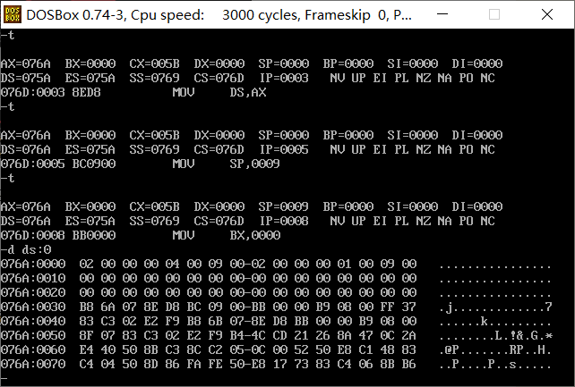 ① 在debug中将执行到line9结束、line11之前,记录此时:寄存器(DS) = _076C___, 寄存器(SS) = __076E__, 寄存器(CS) = _076A___
