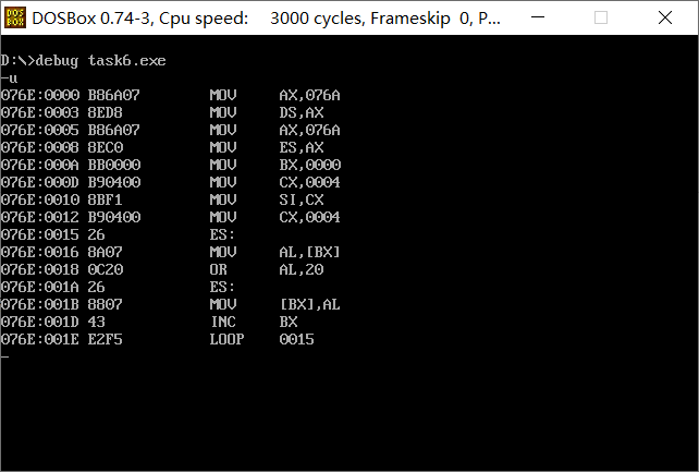 ② 在debug中加载程序,反汇编,执行到line13退出前,用d命令查看data段对应的内存空间,确认每 行第一个单词已经由大写->小写。
