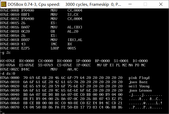 1 assume cs:code, ds:data 2 3 data segment 4 db 'Pink Floyd ' 5 db 'JOAN Baez ' 6 db 'NEIL Young ' 7 db 'Joan Lennon ' 8 data ends 9 10 code segment 11 start: 12 mov ax, data 13 mov ds, ax 14 15 mov ax, data 16 mov es, ax 17 18 mov bx, 0 19 mov cx, 4 20 s1: 21 mov si, cx 22 mov cx, 4 23 24 s2: 25 mov al, es:[bx] 26 or al, 20h 27 mov es:[bx], al 28 inc bx 29 loop s2 30 31 mov cx, si 32 mov bx, 0 33 34 mov ax, es 35 inc ax 36 mov es, ax 37 38 loop s1 39 40 mov ah, 4ch 41 int 21h 42 code ends 43 end start