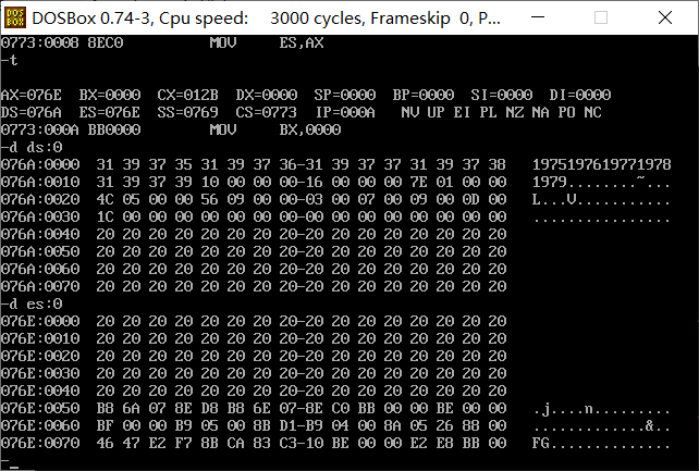 ① 在debug中将执行到line17结束、line19之前,记录此时:寄存器(DS) = 076A____, 寄存器(SS) = _076C__, 寄存器(CS) = _076E___