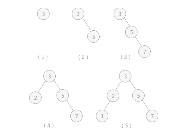 假设原二叉排序树为空树,在对动态查找表 {3,5,7,2,1} 做查找以及插入操作时,可以构建出一个含有表中所有关键字的二叉排序树,过程如图所示: