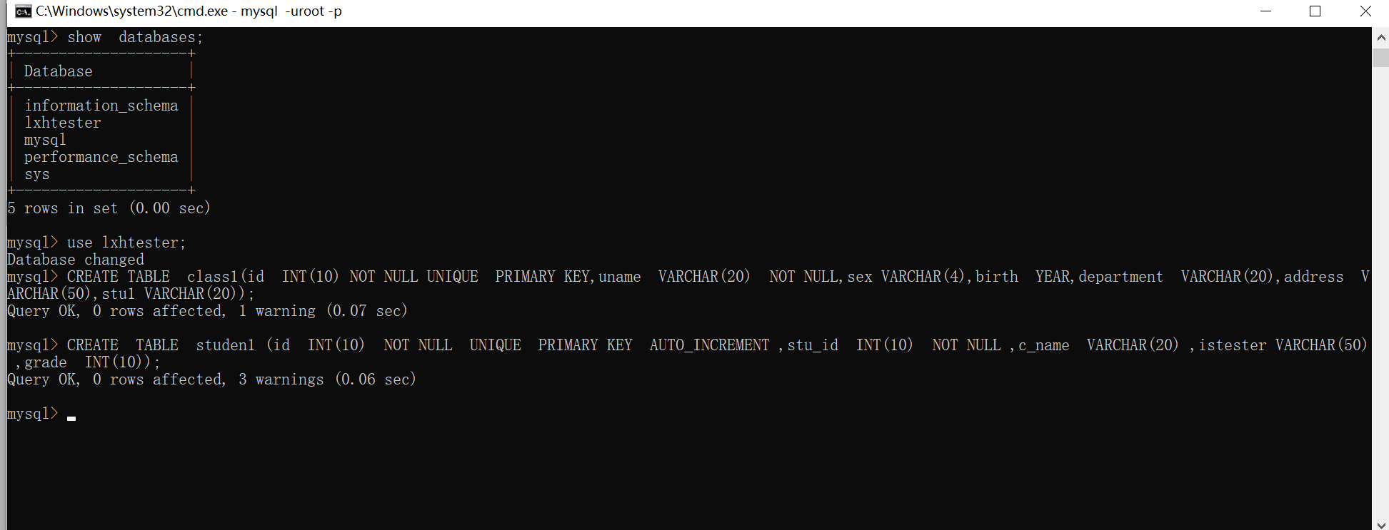 1.场景-在创建的LXHtester数据库下,创建 表class1 和 表studen1