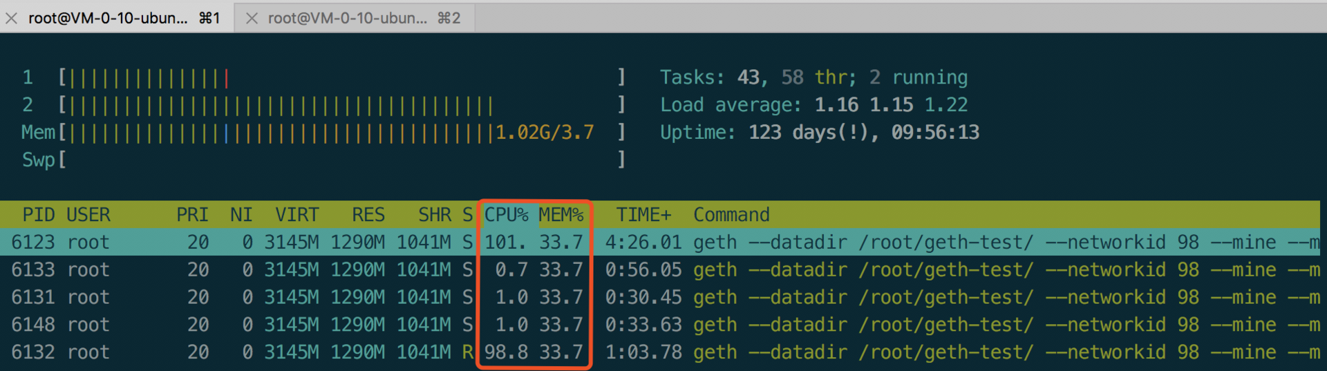 可以看到CPU和内存占用很高,我这里使用测试的机器是2Core 4GB Ubuntu16.04。