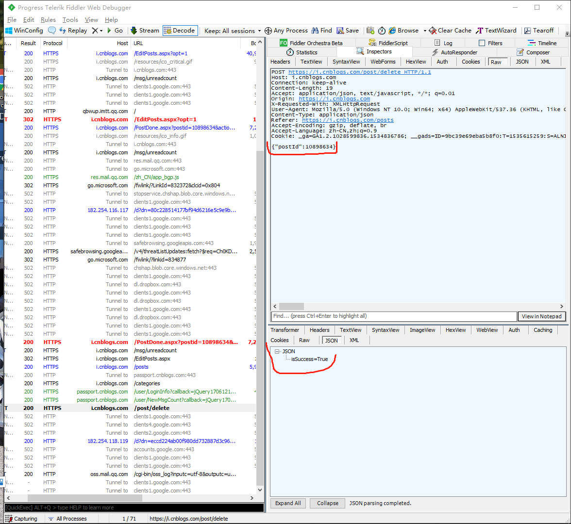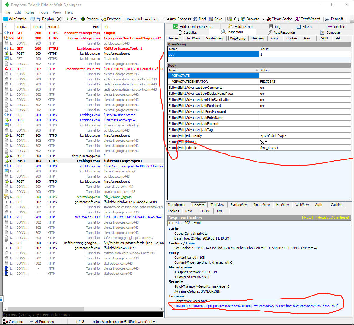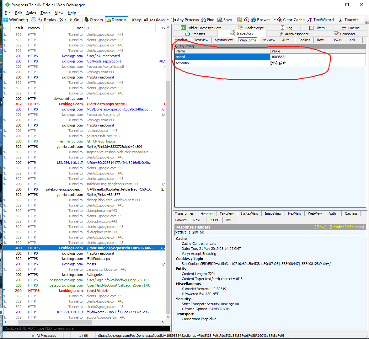 这个postid如何获得? 看上一个请求 i.cnblogs.com/PostDone.aspx?postid=xxxxxx 而这个请求的url可以在添加随笔的请求的结果里抓取到, 看上面的提取postid参数