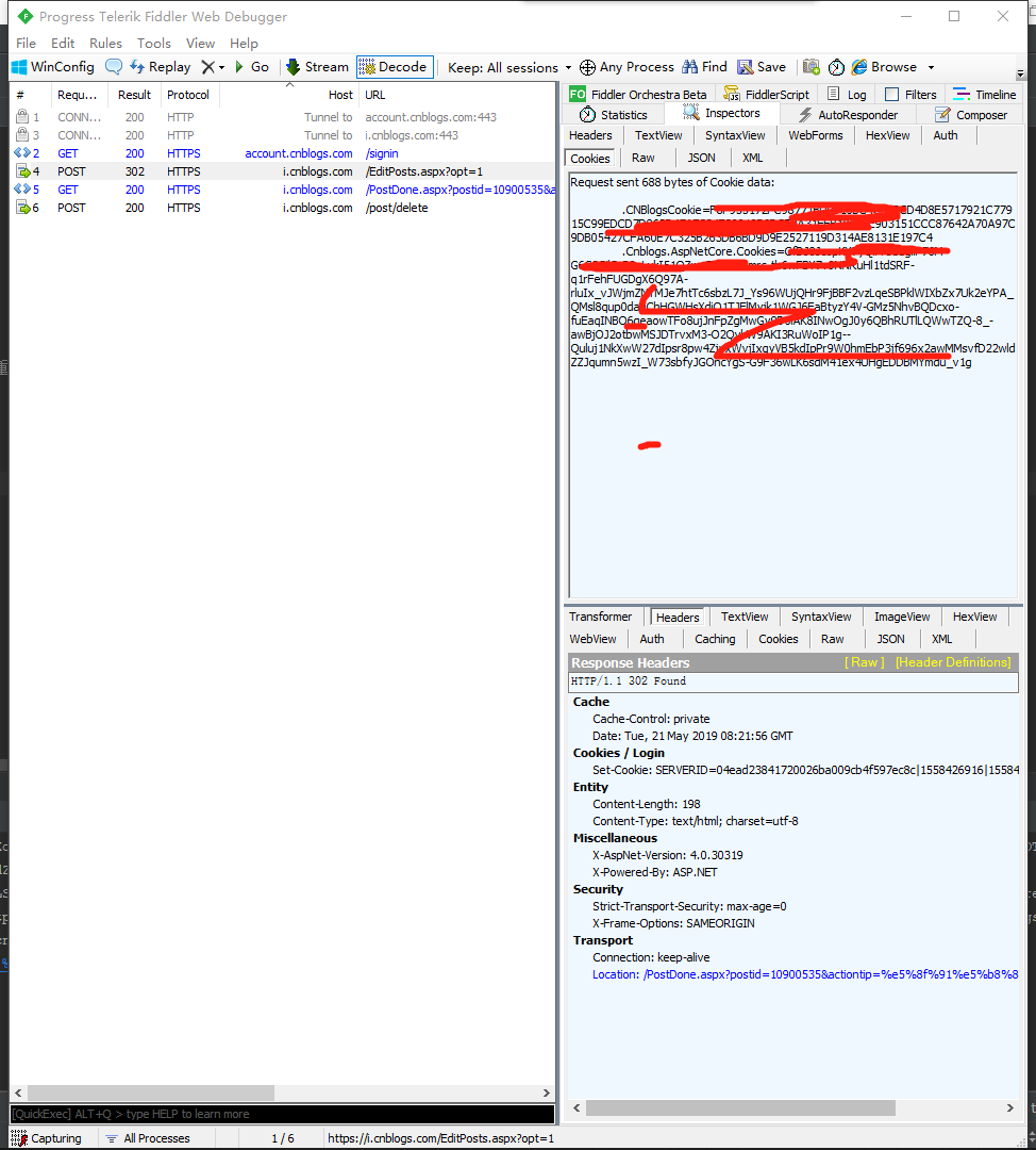 未登录时与登录后各抓取一次,查看cookies的变化(多出的部分就是要添加的cookies) 图上多出两个:.Cnblogs.AspNetCore.Cookies、.CNBlogsCookie