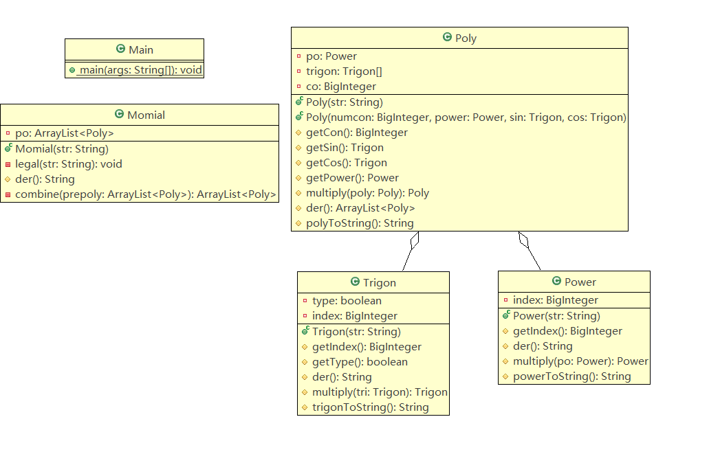 第二次作业加入了三角函数和有多个因子组成的项这个概念,在听了老师在课上的讲解与分析后,我完成了这个由5个类构成的程序。第二次作业时,我已经对抽象出对象的这个概念有了大概的理解,再加上有了第一次作业的经验,我对类的设计更加成熟了。不过当时我并没有学会继承与多态,所以这次的代码里其实有很多没必要的重复。主要出现在Power和Trigon两个类中。