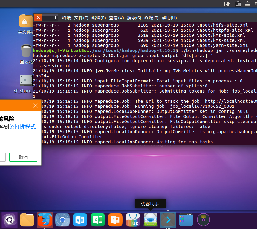 运行MapReduce示例作业,输出结果放在output目录下。、