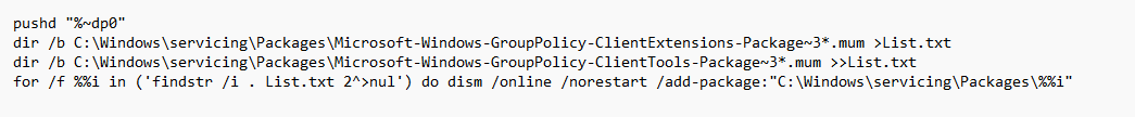 pushd "%~dp0" dir /b C:\Windows\servicing\Packages\Microsoft-Windows-GroupPolicy-ClientExtensions-Package~3*.mum >List.txt dir /b C:\Windows\servicing\Packages\Microsoft-Windows-GroupPolicy-ClientTools-Package~3*.mum >>List.txt for /f %%i in ('findstr /i . List.txt 2^>nul') do dism /online /norestart /add-package:"C:\Windows\servicing\Packages\%%i"