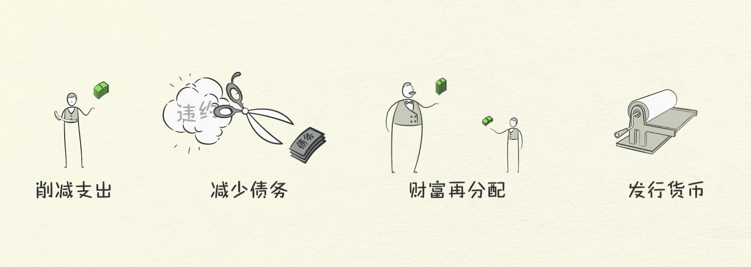 贷款人停止放贷,借款人停止借贷。整个经济体与个人一样都失去了信用,那么该如何去杠杆化呢?问题在于,债务负担过重,必须减轻;为此可以采用四种方法。