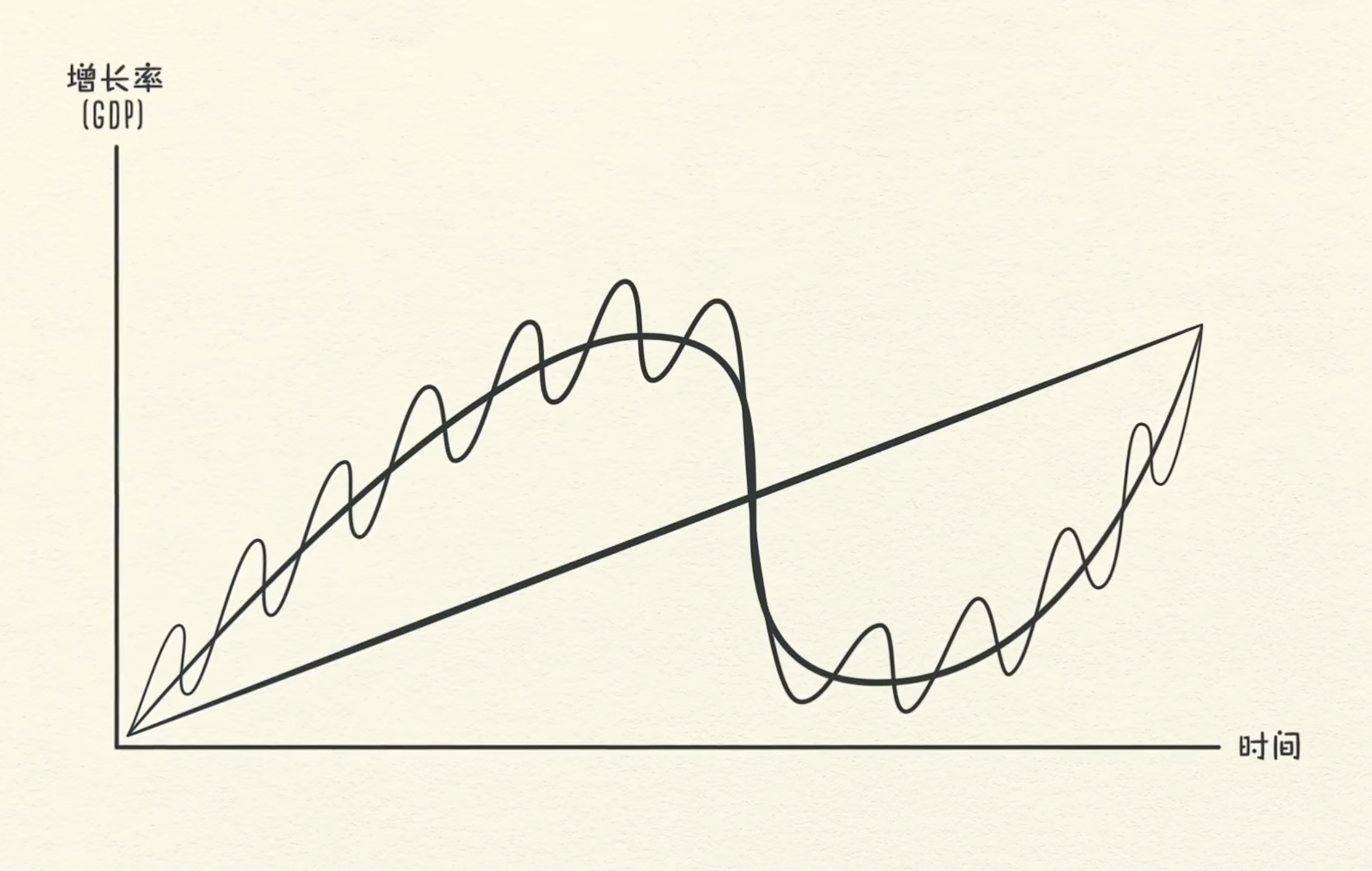 如上所述,经济的波动不取决于创新和工作的努力程度,而主要是看信贷情况。设想一个没有信贷的经济模式。在没有信贷的经济模式中,只有提高收入才可以增加支出,因此需要提高生产率和工作量。提高生产率是经济增长的唯一途径。当我或其他人的生产效率提高时,经济就会增长。如果我们观察各种交易,加以总结,就会发现一条类似于生产率增长轨迹的渐进线。但是由于借贷的存在,经济周期就产生了。其原因并不在于法律和规则,而是在于人的天性和信贷运作方式。